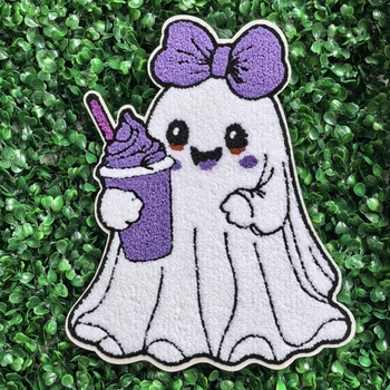 Nuevo diseño Popular fantasma sosteniendo una taza para Halloween púrpura helado bordado parches para planchar para ropa