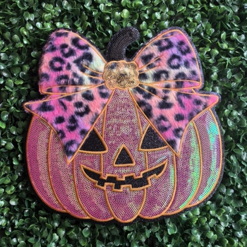 Parche de lentejuelas con lazo rosa y estampado de leopardo para Halloween, parche bordado de calabaza fantasma, tamaño Arge, ecológico, para coser para ropa
